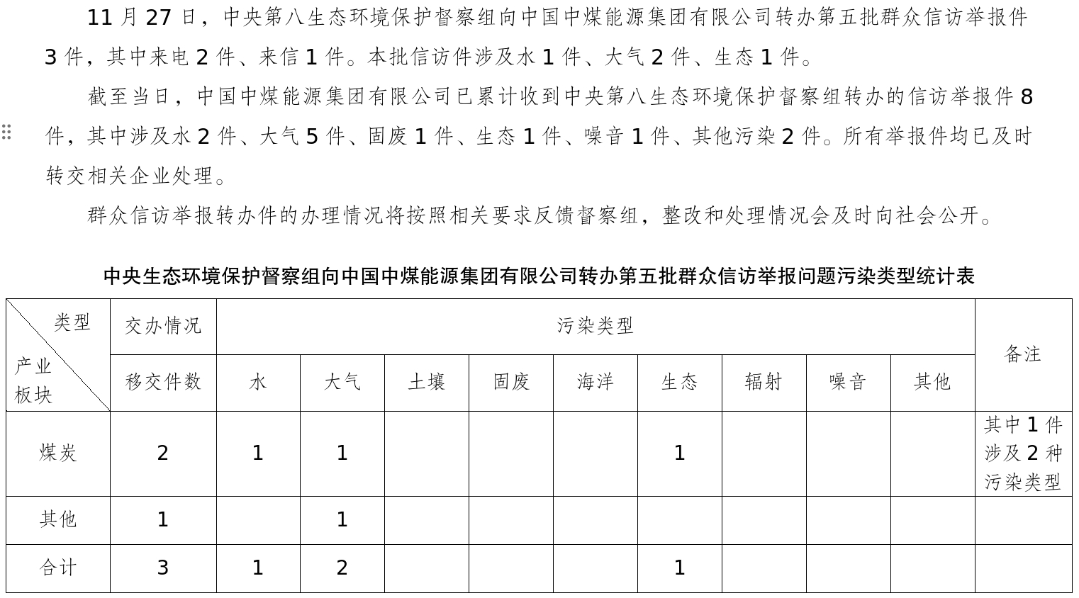 中央第八生態(tài)環(huán)境保護(hù)督察組向中國(guó)中煤能源集團(tuán)有限公司轉(zhuǎn)辦第五批群眾信訪舉報(bào)件
