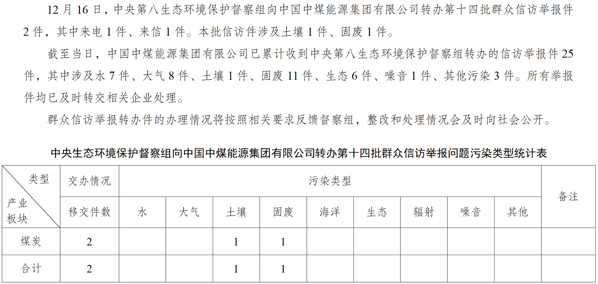 中央第八生態(tài)環(huán)境保護督察組向中國中煤能源集團有限公司轉辦第十四批群眾信訪舉報件