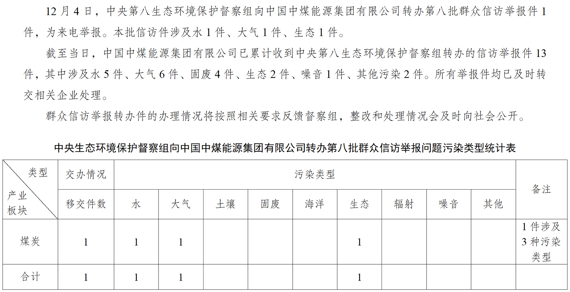 中央第八生態環境保護督察組向中國中煤能源集團有限公司轉辦第八批群眾信訪舉報件