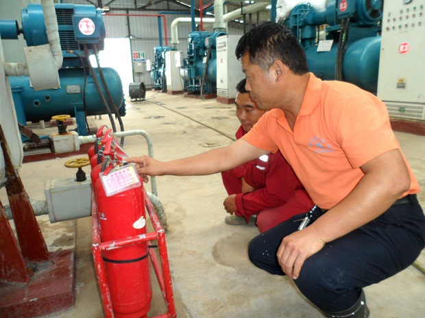 班組進行安全隱患排查,班長正在檢測滅火器壓力是否達標